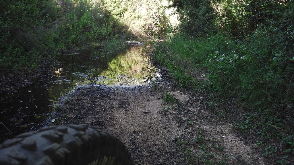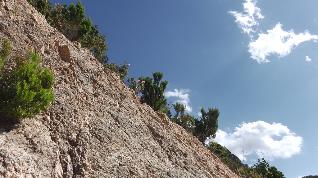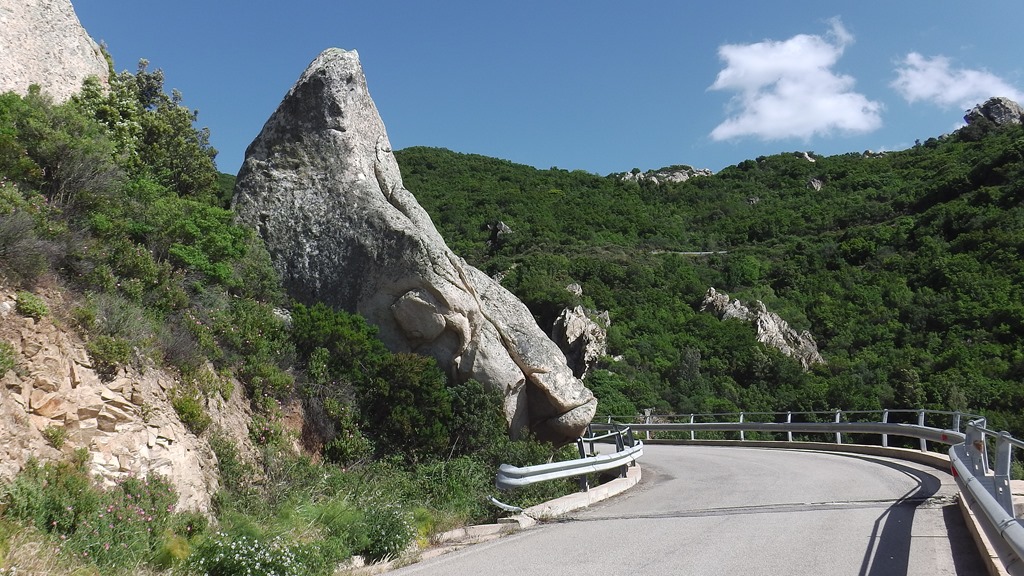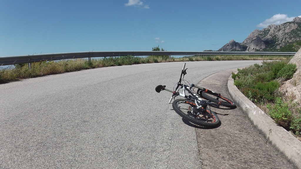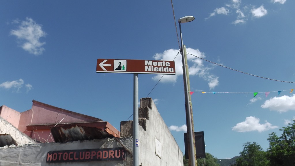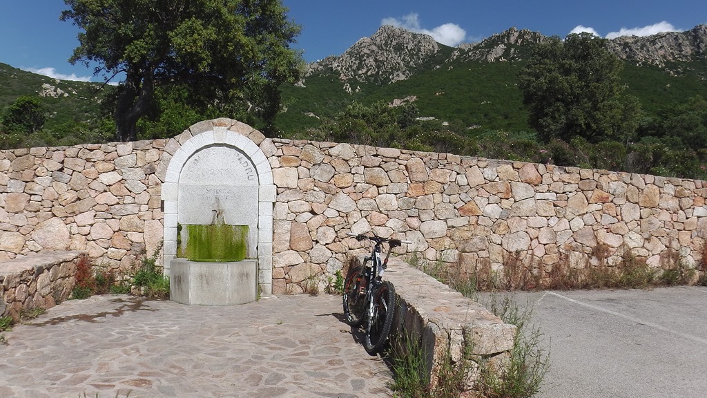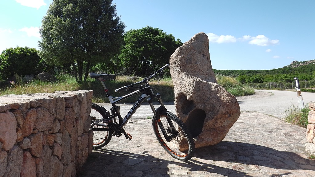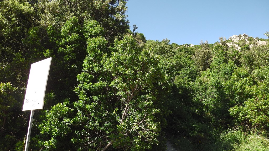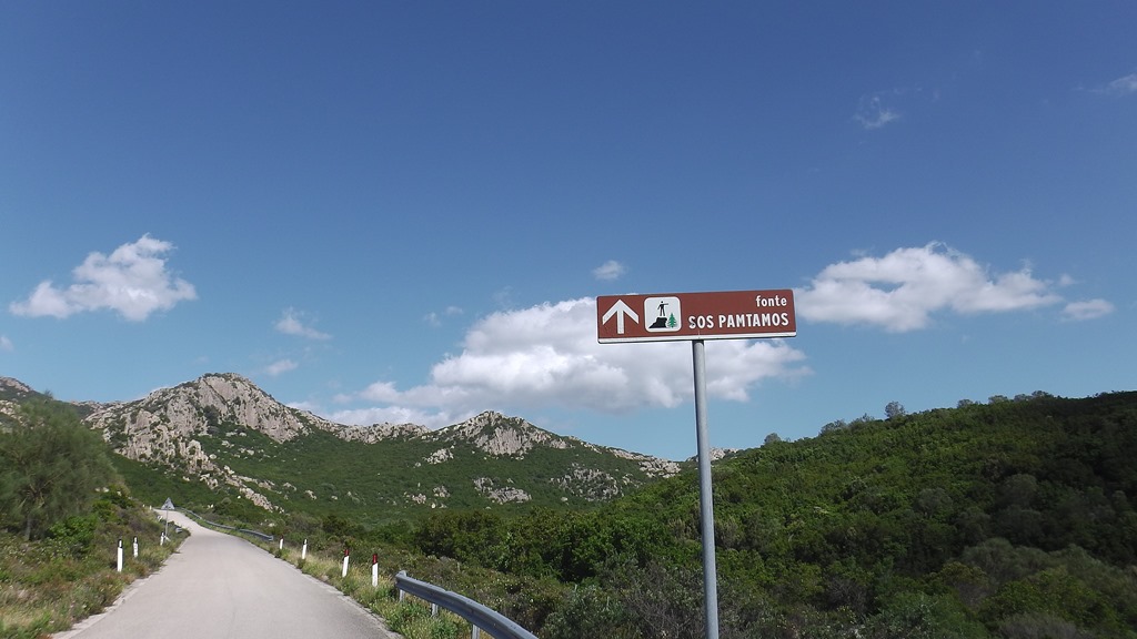 Die Tour ist nur in der aufgezeichneten rechts Richtung empfehlenswert zu fahren. Wer auf 2 Std. Trail bergauf schieben steht kann sie aber gerne auch umgekehrt befahren. Wir halten uns auf der noch viel befahrenen SS125 Richtung Olbia um ein paar hundert Meter nach der Ortseinfahrt auf die 4 Corsi – keine Ahnung warum eine Bergstraße mit mehr als vier Kurven so benannt ist – in Richtung Padru. Noch ist die Straße gut befahren, was daran liegt das sie eine Zubringerstraße zur Autobahn ist, nach der Auffahrt hinter Li Cupponeddi wird es dann schlagartig einsam und ruhig. Und so fahren wir locker auf gut asphaltierter Straße an gefühlten 20 Agriturismo durch das kleine Örtchen Biasi nach Padru. In Padru selbst halten wir uns einfach rechts auf der Hauptstraße bis wir noch im Ort auf die beschilderte Abzweigung links zum Monte Nieddu treffen, der wir folgen. Der laut Karte als Fahrweg/Forstweg (weiß) gekennzeichnete Weg ist eine gute ausgebaute und quasi nie befahrene Bergstraße die uns bis zum SOS Pantamos Brunnen auf gute 600 hm bringt. Hier ist ein guter Platz um sein Wasser wieder aufzufüllen und ein wenig Brotzeit in der im Schatten befindlichen Picknickbank zu machen. Damit wir aber in den Trail einsteigen können müssen wir erst den Einstieg finden. Unser Ziel auf der Karte ist mit La Padula beschrieben und als Wanderweg eingezeichnet. Soweit klingt es ganz einfach, nur gibt es auf Sardinien nur wenig wirkliche Wanderwegkennzeichnungen. Wir müssen um zum Einstieg zu gelangen die Straße wieder runter rollen und zwar genau so weit bis wir uns in einer Art Senke mit Kehre befinden. Hier finden wir ein unscheinbares weißes Schild mit einer mit Klebeband aufgeklebten Schrift RIO irgendwas. Direkt hinter dem Schild führt ein handbreiter, kaum sichtbarer Pfad in die Macchia. Jetzt nur nicht den Mut verlieren. Ab hier müssen wir knappe 20 Minuten den Wanderweg nach oben schieben. Ist alles machbar und nicht wirklich anstrengend da wir keine 150 hm hinter uns bringen müssen. Einzig das Gestrüpp und die Dornenbüsche machen es ein wenig unangenehm. Das gehört aber eben zum Biken auf Sardinien dazu. Nach 20 Minuten erreichen wir eine Art Kamm/Lichtung die wir nutzen um uns die Schutzbekleidung anzulegen. Ab jetzt beginnt der Trail Spaß. Über verblockte Stellen, loses Geröll und das fiese Sandgestein zirkeln und trailen wir uns bis zum La Padula. Nach 30 Minuten Trail Spaß vom Feinsten spuckt uns der Pfad auf einer Forstrasse wieder aus. Dieser folgen wir dann rechts um auf den nächsten Trail zu gelangen folgen wir der Forstrasse bis diese sich teilt. An der Weggabelung biegen wir links ab. Was jetzt kommt ist ein bekannter und in der Karte als Bike Tour eingezeichneter Trail, den ich auf GPS Tour Info schon mal beschrieben habe. Es ist der Downhill Teil der Feuerwärterhaus Tour.
